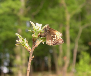 | ミヤマセセリ モミジイチゴの花にも吸蜜にやってきていたが、花が下向きに咲いているため撮影角度をとりにくい。結局、この様な枯葉などに止まった写真が多くなってしまう。 |