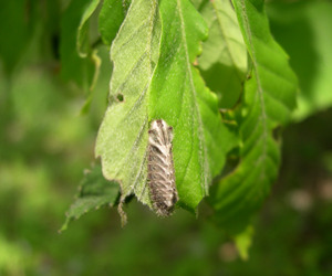 | オオミドリシジミの幼虫(カシワ) カシワのオオミドリは無事に育っていた。孵化してしばらく餌にありつけなかったせいか、コナラの幼虫に比べ成長がかなり遅い。同じ枝には、この幼虫以外に2頭確認できた。 |