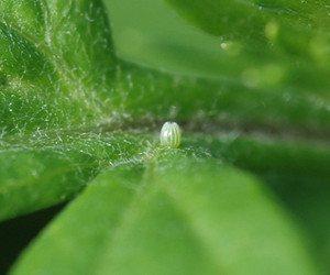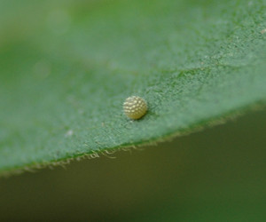 | イチモンジチョウの卵 スイカズラの周りを翔ぶイチモンジチョウを見つけ観察していると産卵を始めた。その葉を確認すると、木苺に似た卵が見つかった。 |