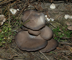 | ヒラタケ 西久保田んぼ(2005.12.11) 田んぼのわきの水路に横たわっていた朽木(コナラ)に発生していた。季節は冬だというのにまだ瑞々しさを保ち、最も大きなものは傘の直径が20cmもあった。本来このキノコはヤマザクラや桑の立ち枯れ木などによく発生する。 |