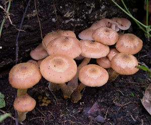 | クリタケ 西久保田んぼ奥(2002.11.4) 山の手入れがされなくなったことにより、倒木などが増え朽木から発生するキノコは増えたような気がする。クリタケはその代表格。歯ごたえもよく味もいい。 |